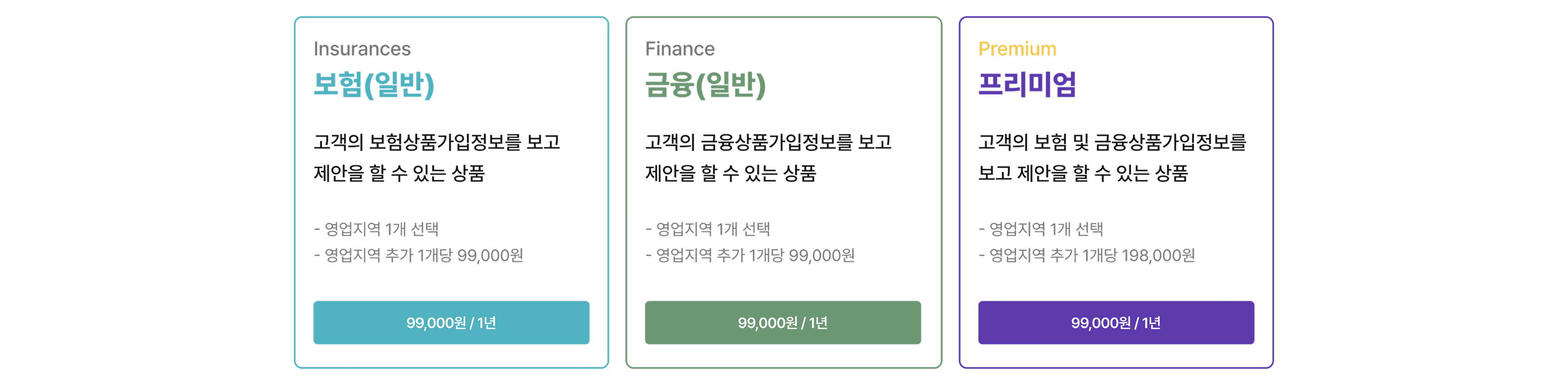 3. 결제하기결제하기를 누르시면 결제 창으로 이동됩니다. 블루세일은 세가지 구독상품을 제공합니다.보험(일반) 열람 상품오직 영업만을 위한 고객정보 리스트[ 고객명(비실명), 지역, 직장명, 연소득, 가입 보험상품 보험사, 전체 보험상품 리스트, 보험 납부금액, 특약정보(일부)]