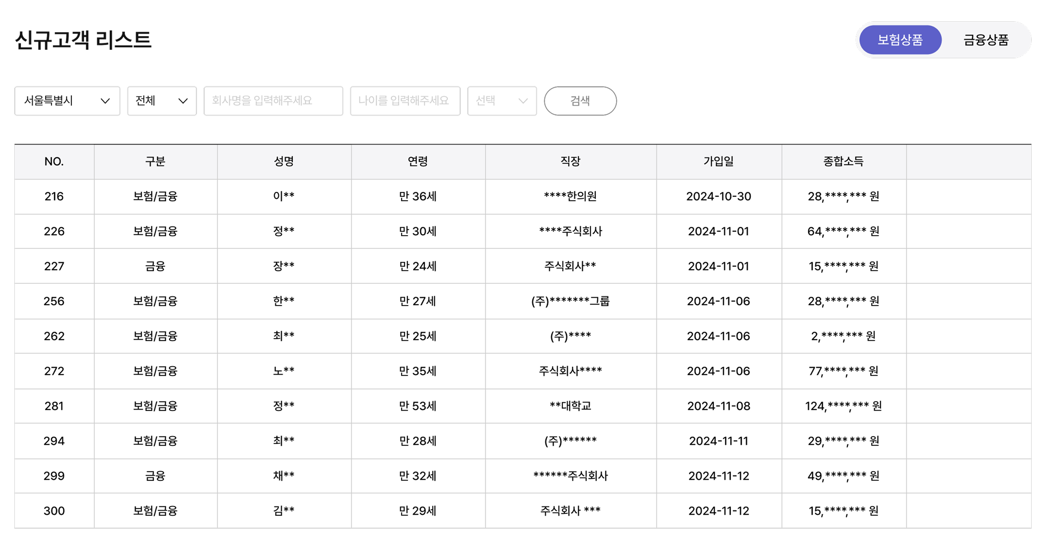 2. 각 고객의 나이와 직장명, 대략적인 종합소득이 간략하게 보여집니다.