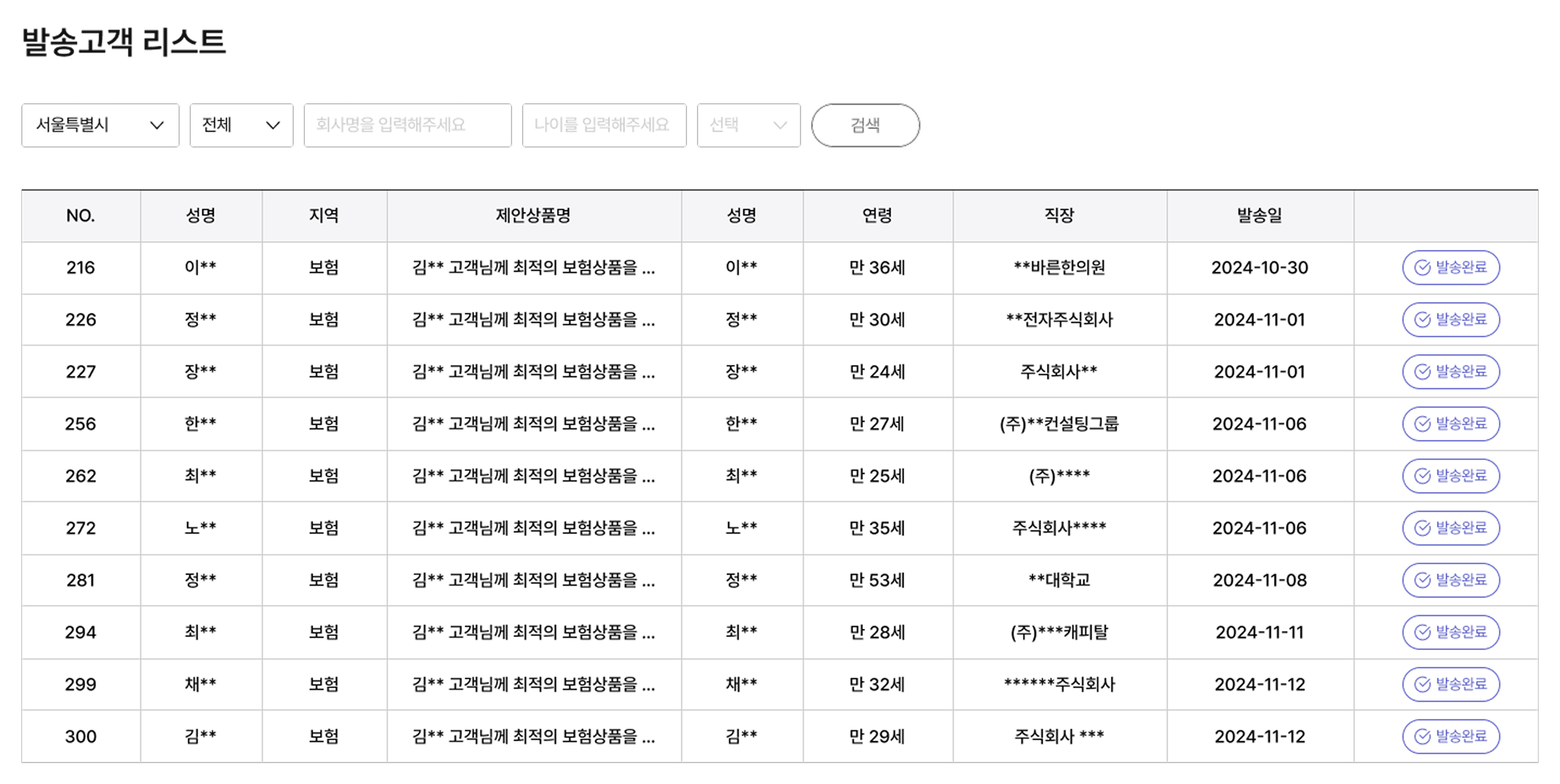 고객의 읽음 상태, 수락 상태를 확인 할 수 있습니다.1. 지역별/상품별로 볼 수 있으며 회사명과 나이 등으로 찾아볼 수 있습니다.
